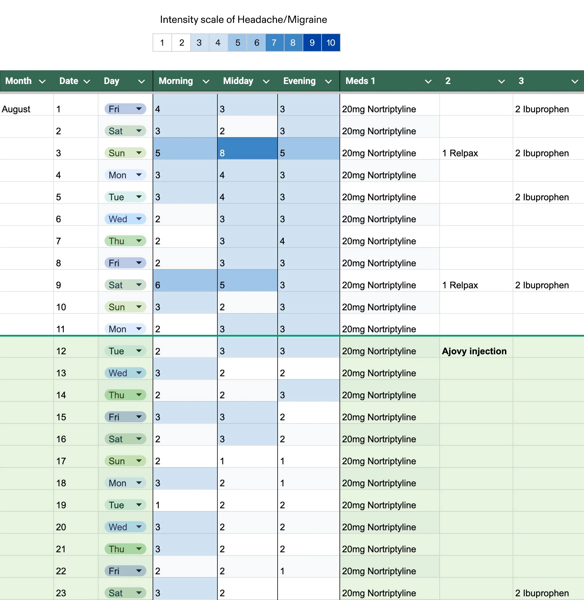 Below is a screenshot from my headache and migraine tracking spreadsheet showing days before and after starting Ajovy. I track intensity of symptoms three times a day – Morning, Midday and Evening. I also track meds. You can see a clear reduction in the intensity of my headaches and migraine frequency, and medication use, post my first injection on 12th August. It is still early days, but feeling quietly positive for what lies ahead.